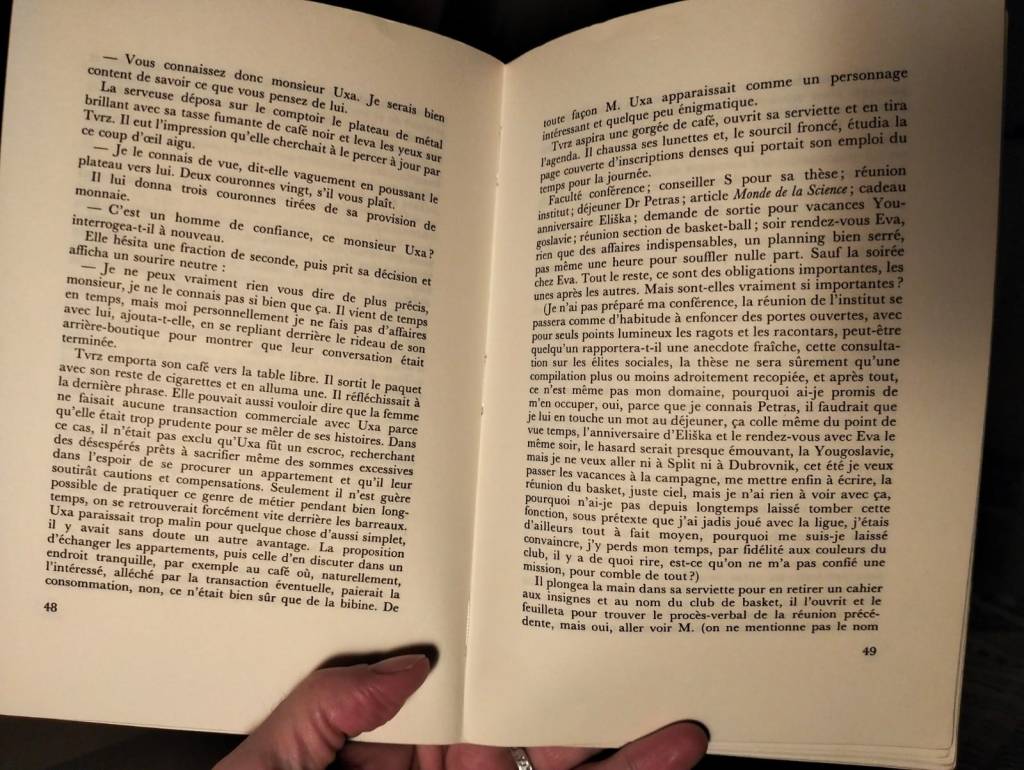 C’est quand même marrant, la faculté des auteurs tchèques à naviguer en permanence aux confins de l’absurde, flottant tout en langueur sur un océan kafkaïen, s’octroyant quelques escales sur un îlot de situations cocasses. Le héros (sic) du Passage ne navigue pas très loin, puisqu’en traversant un jour un de ces passages commerciaux dont est garni l’hypercentre de Prague, il finit par s’y retrouver coincé comme dans une faille spatio-temporelle dont il s’accommode très bien. Le tout baigne dans une atmosphère en clair-obscur très particulière, drolatique et amère à la fois. Une espèce de spleen slave, une douce mélancolie qui ne trouve son équivalent nulle part ailleurs, même pas dans la saudade brésilienne.