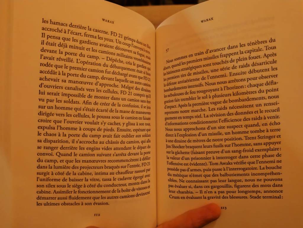Son Sniper nous avait glacé le sang, Warax lui fait refaire un tour à vide dans la grande mécanique du cœur désormais vide de sens. C’est tendu, suffoquant, ca avance par à coup (quand ca avance) en sautant du coq à l’âne, ou plutôt de la bande d’immigrés mexicains à l’amnésique perdu dans un désert militarisé. Un des écrivains les plus radicaux et dérangeants de la littérature contemporaine.