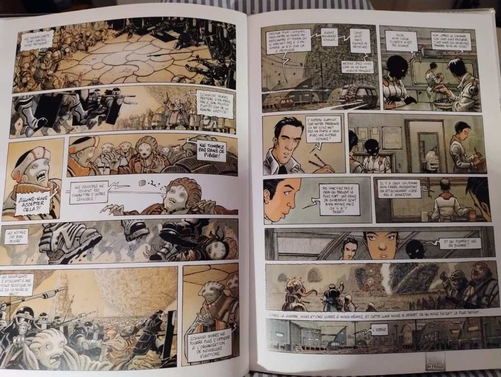 Une bédé à déguster comme une (bonne) série de SF sur Netflix : ça laissera pas un souvenir impérissable, c’est aussi crédible que Louis Sarkozy président (euh, attends…), c’est bourré de références increvables (on a vu les mêmes films et lu les mêmes bouquins, mec) et ça tient plutôt bien la route le reste du temps. Ça reste quand même bien moins marrant que le best of des citations de Loulou Sarko et carrément un poil en dessous d’Universal War One, mais on ne peut pas tout avoir.